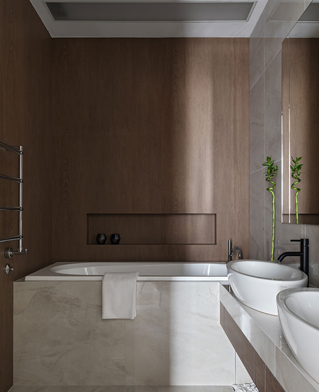 Отделочные материалы и мебель заказывали из Европы: часть плитки была привезена из Италии, часть из Польши. Ванная комната при спальне получилась довольно минималистичная, облицовка стен тут выполнена крупноформатными плитами. Не обошлось и без местных фабрик: паркет в гостиной и столовой выбрали белорусской марки Woodberry, а вся корпусная мебель была изготовлена на заказ в местных столярных мастерских.