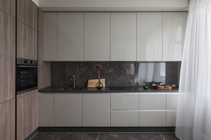 Кухня. Фартук и пол, керамогранит Ibero Pulpis Grey. Гарнитур выполнен на заказ в столярной мастерской.