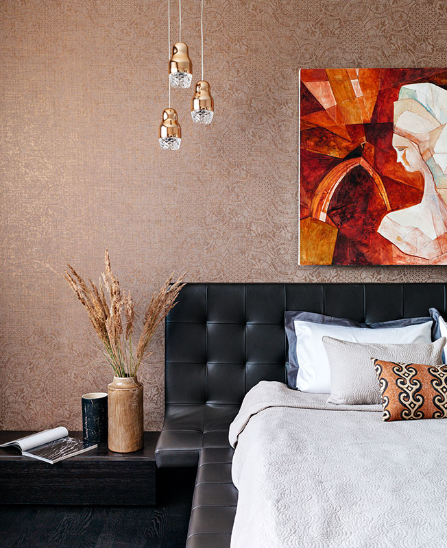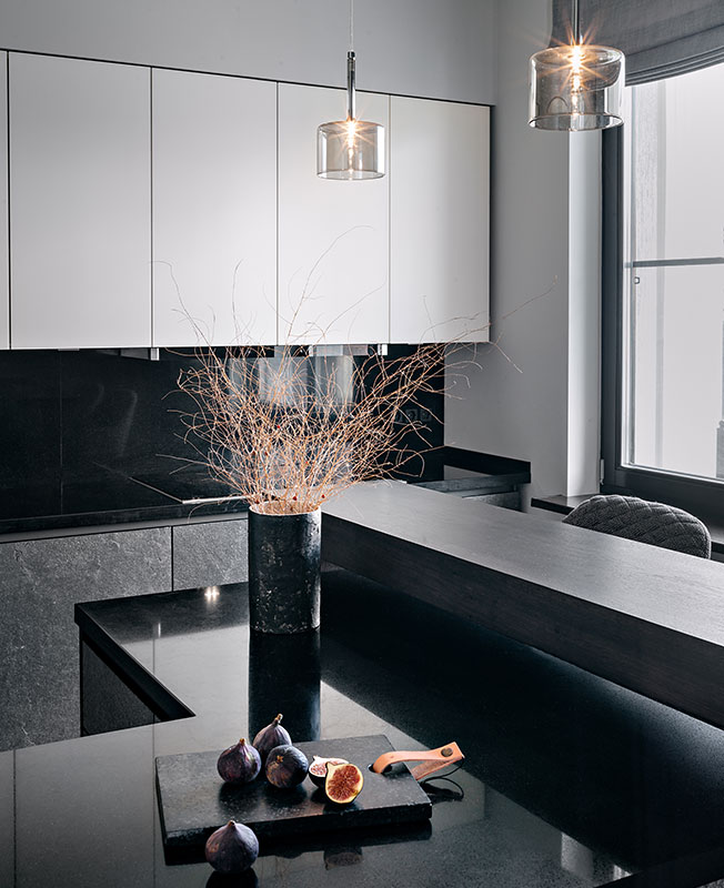 Главным героем первого этажа стал обеденный стол Gallotti&Radice с зеркальной ножкой из хромированного металла, который отражает и преломляет напольный орнамент. Панно из керамогранита было разработано и выполнено на заказ. Подвесные светильники над обеденным столом олицетворяют утренние капельки росы.