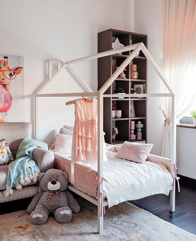 На втором этаже разместилась приватная зона — главная спальня и детская для двух девочек-погодок. Хозяйка дома настаивала, чтобы к каждой спальне прилегал санузел и гардеробная. Здесь же находится еще одна детская «на вырост», в которой выполнена только отделка. Чтобы сделать мансардный этаж полноценным жилым, крышу приподняли. Также дом оборудовали лифтом — заказчики позаботились о пожилых родителях.