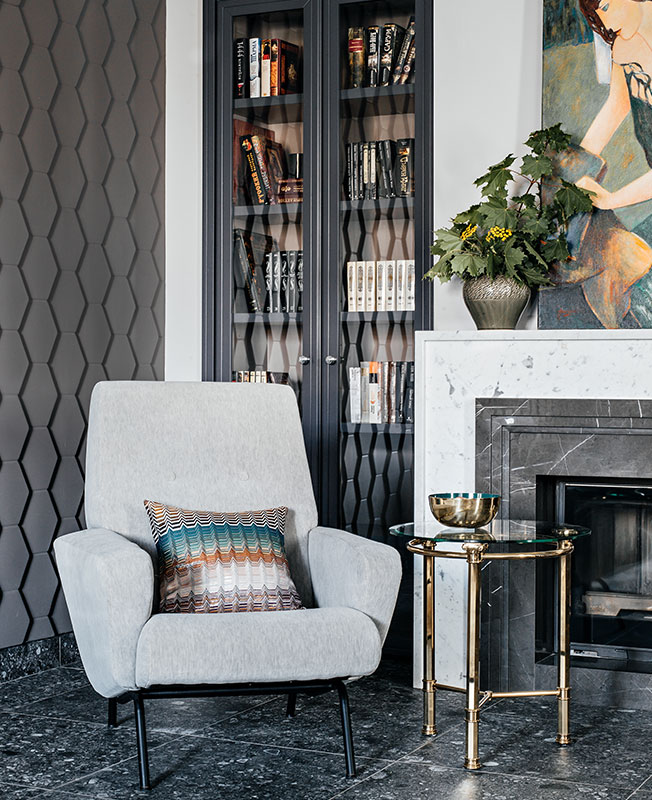 Планировочное решение первого этажа направлено на визуальное объединение зон холла, гостиной, каминной и кухни. Также заказчики просили разместить небольшую библиотеку — ей нашлось место у камина в виде встроенных стеклянных витрин. Дизайнер предусмотрела несколько сценариев зонирования пространства. Например, кухню можно закрыть высокими раздвижными перегородками с матовым тонированным стеклом.