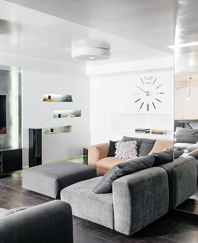 «3D-панели в виде сот на стене в гостиной освещаются направленными светильниками. Когда их включаешь, можно увидеть оптическую иллюзию – соты двоятся, «плывут» и становятся еще объемнее. Абсолютно гипнотический эффект, напоминает детскую игрушку «калейдоскоп». Заказчица, когда впервые увидела, испугалась. Эффект был весьма неожиданный».