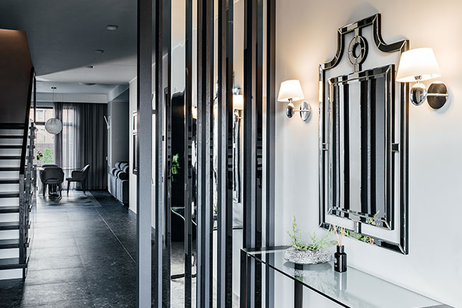 В первую очередь, главный вход перенесли из центральной части дома в боковую. Таким образом получилось выделить под холл отдельное помещение с большим окном, гардеробом и диванчиком. Здесь же под лестницей оборудована небольшая кладовка, скрытая за гладкими фасадами дверей без ручек.