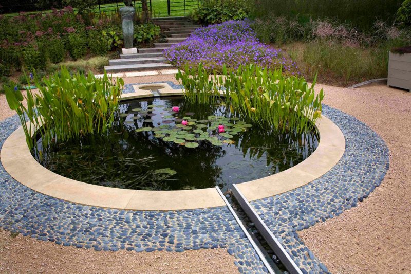 Проход через воду заменит мост или пешеходный мост. Он не доминирует над поверхностью воды, он позволяет присматриваться к растениям, и в то же время выглядит оригинально.