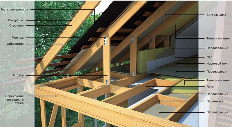 Конструкция аналогична конструкции крыши плоской, она состоит из ряда балок, которые своими концами опираются на верхние части противоположных стен – высокой и низкой. Но при этом односкатная крыша имеет массу преимуществ – благодаря скату вода, снег и мусор на ней не задерживаются, нет необходимости применять специальные герметизирующие кровельные материалы – прекрасно подойдут любые материалы для кровли, которые используются для всех скатных крыш.