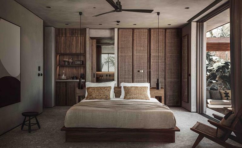 Курорт со 106 комнатами отличают красивые серые камни и бетон. Дизайнеры берлинской студией Lambs and Lions экспериментировали с естественными оттенками земли, изрезанными каменными стенами, узкими проемами, тростниковой мебелью ручной работы. На некоторых виллах есть собственные глубокие бассейны с каменной облицовкой.