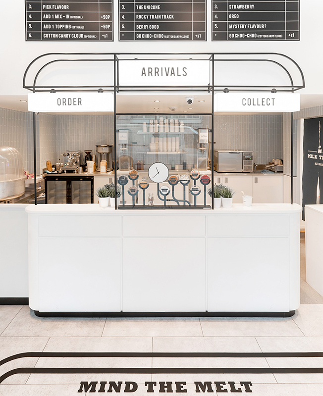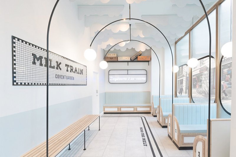 Дизайнеры студии FormRoom, которая базируется в Шордитче, оформили интерьер кафе Milk Train в центре Лондона. Известный креативным оформлением своего мороженого, «молочный трамвай» получил адекватное пространство.
