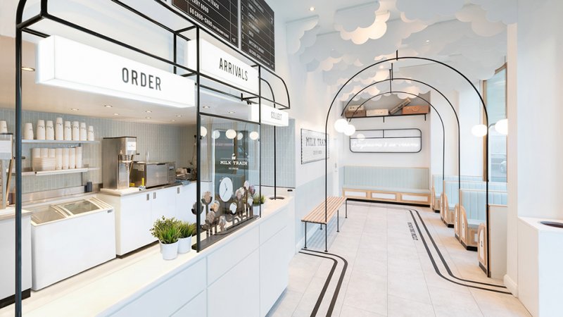 Дизайнеры студии FormRoom, которая базируется в Шордитче, оформили интерьер кафе Milk Train в центре Лондона. Известный креативным оформлением своего мороженого, «молочный трамвай» получил адекватное пространство. Хит среди предложений Milk Train — разноцветное мороженое в облаке сладкой ваты. Отсюда декоративные «облачные» мотивы под потолком. Пастельная палитра служит отличным фоном для фото в Instagram, а неоновые надписи — яркими акцентами. Уже ставшее популярным среди покупателей, заведение станет образцом для других магазинов Milk Train. «Сам продукт обладает чувством игривого сюрреализма и заказчик хотел перенести это ощущение волшебства в интерьер, — говорят дизайнеры. — Поскольку это было их первое постоянное пространство, дизайн должен был быть уникальным и взаимозаменяемым в любое время года; чтобы интерьер бренда развивался так же быстро, как и тенденции в Instagram». Одним из источников вдохновения авторы проекта называют эстетику классического британского паровоза. Часть стеклянных панелей фасада матовая, словно затуманенные окна вагона. Сиденья пронумерованы, как железнодорожные платформы, а меню напечатано на досках, похожих на табло отправления поездов. Облака под потолком и сферические светильники отсылают к выходящему из трубы дыму, а сходство с поездом завершает уложенный на полке багаж. View this post on Instagram Our new blue Milk Train Unicone to help you get over your hump day blues ? ?????? A post shared by M I L K ? T R A I N (@milktraincafe) on Jan 9, 2019 at 5:49am PST