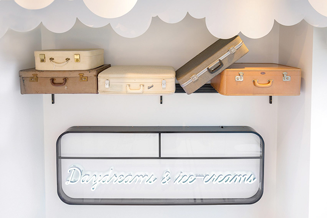 Хит среди предложений Milk Train — разноцветное мороженое в облаке сладкой ваты. Отсюда декоративные «облачные» мотивы под потолком. Пастельная палитра служит отличным фоном для фото в Instagram, а неоновые надписи — яркими акцентами. Уже ставшее популярным среди покупателей, заведение станет образцом для других магазинов Milk Train.