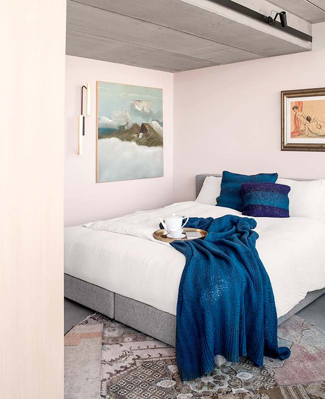 Когда у берлинского архитектора Эстер Бруцкус, Bruzkus Batek Architects появилась возможность перебраться со второго на верхний этаж многоквартирного дома в Берлине, она воспользовалась шансом переосмыслить свое жизненное пространство. И создала интерьер с продуманной планировкой и панорамным видом на город. Квартира расположена в первом многоквартирном доме, построенном после падения Берлинской стены в районе Пренцлауэр-Берг. Изначально она представляла собой лофт с открытой планировкой, простирающийся между восточным и западным остекленными фасадами здания, с узкими террасами с обеих сторон. Первым делом Эстер изменила планировку — выстроила в пространстве геометрические объемы, чтобы разделить квартиру на зоны, но не изолировать помещения друг от друга. Так в центре появилась конструкция из светлого дуба, которая отгораживает спальню от L-образной кухни-столовой-гостиной, не лишая пространства дневного света. С внешней стороны в эту структуру встроен кухонный гарнитур с рабочими поверхностями и фартуком из терраццо и нижними шкафами нежно-розового цвета. Палитру разбавляет светло-зеленый обеденный стол, изготовленный на заказ. Его оттенок перекликается с внутренней отделкой верхних кухонных шкафов. Комбинация розовых и зеленых оттенков проходит через весь интерьер — в отделке стены в зоне гостиной, обивке дивана, выполненного на заказ, цвете ковра или стеклянных ваз. Деликатность пастельных тонов уравновешивает строгий цвет и фактура бетонного пола и потолка, как и мягкая текстура берберского ковра оттеняет блестящий мрамор лаконичных столиков. Еще один цвет — синий — в интерьере присутствует почти тайно. Строгая стена из окрашенных в серый цвет деревянных реек скрывает насыщенно-синий гардероб, а ванной, вход в которую спрятан в центральном объеме, светло-серое мраморное терраццо соседствует с голубыми стенами, тумбой под раковину из каррарского мрамора и обоями по мотивам «Большой волны в Канагаве» Хокусая. Одно из главных достоинств квартиры — открытые террасы с видом на Берлин и частным садом, спроектированным в сотрудничестве с ландшафтным архитектором Аней Кнот и задуманным как серия объемов и платформ. Чтобы соединить внешнее пространство с внутренним, Эстер расширила подоконники панорамных окон, превратив их в многофункциональные платформы, словно продолжающие пол террасы.