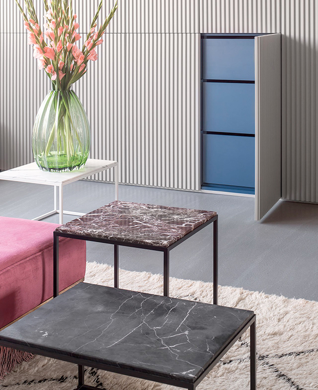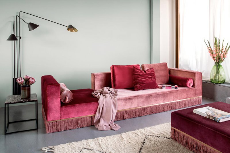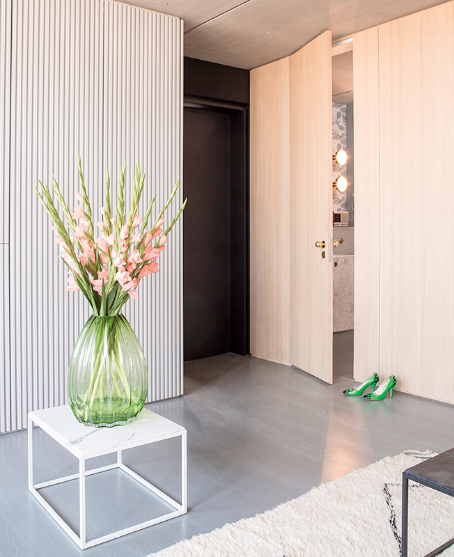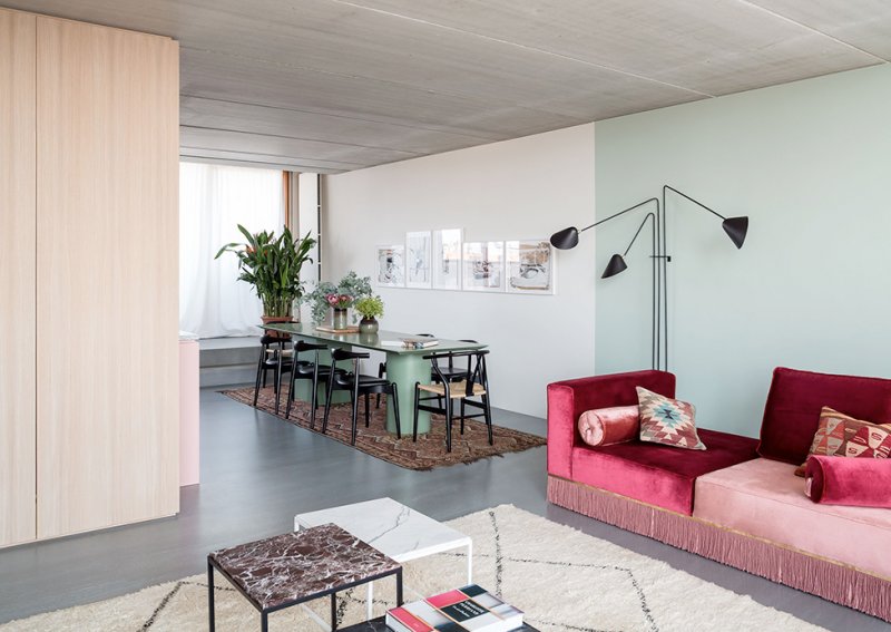 Комбинация розовых и зеленых оттенков проходит через весь интерьер — в отделке стены в зоне гостиной, обивке дивана, выполненного на заказ, цвете ковра или стеклянных ваз. Деликатность пастельных тонов уравновешивает строгий цвет и фактура бетонного пола и потолка, как и мягкая текстура берберского ковра оттеняет блестящий мрамор лаконичных столиков.