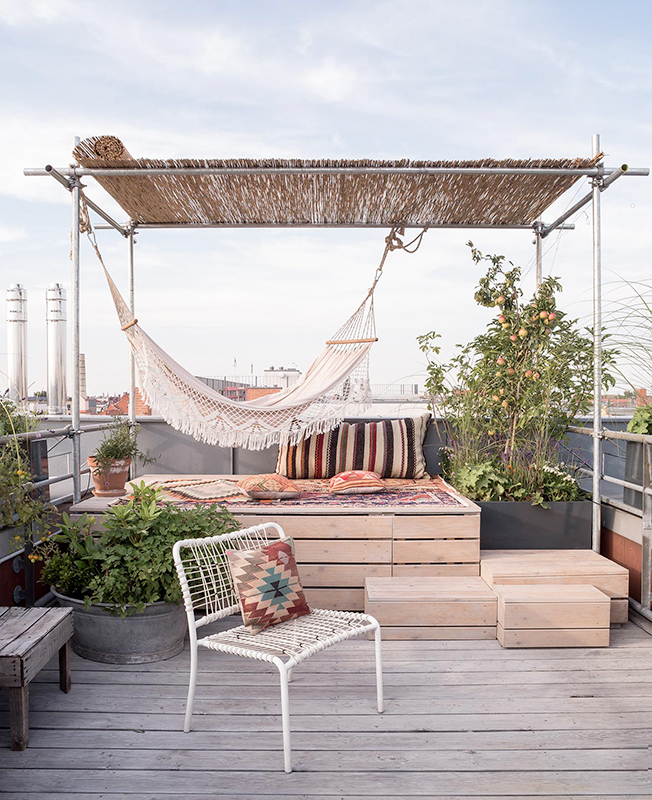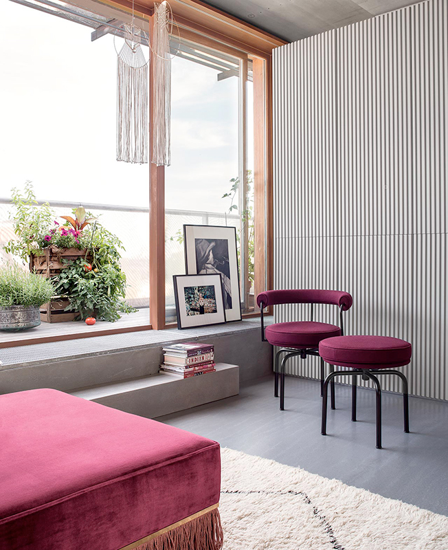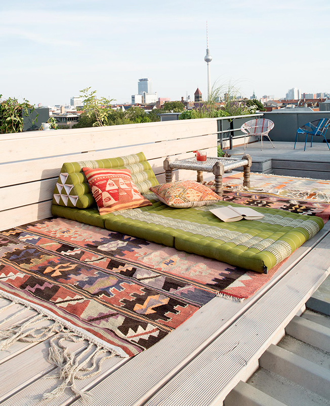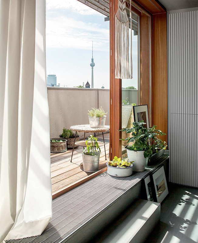 Одно из главных достоинств квартиры — открытые террасы с видом на Берлин и частным садом, спроектированным в сотрудничестве с ландшафтным архитектором Аней Кнот и задуманным как серия объемов и платформ. Чтобы соединить внешнее пространство с внутренним, Эстер расширила подоконники панорамных окон, превратив их в многофункциональные платформы, словно продолжающие пол террасы.