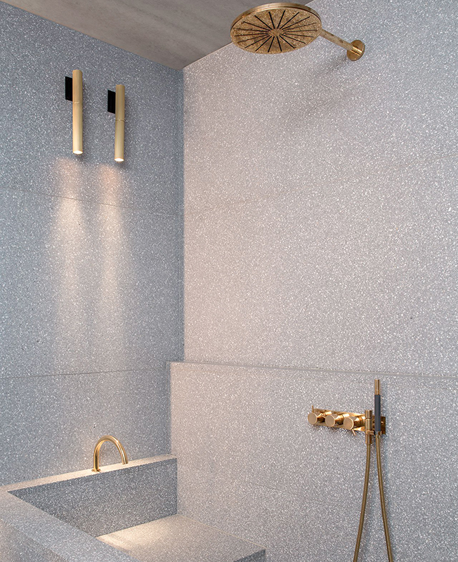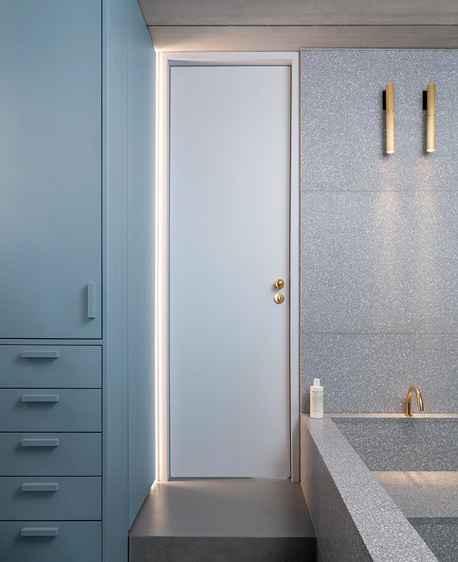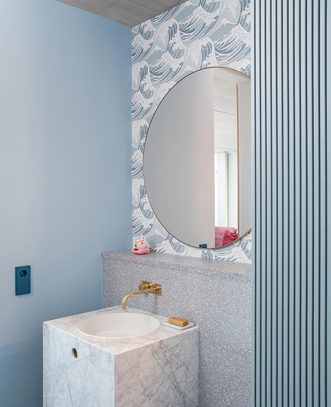 Еще один цвет — синий — в интерьере присутствует почти тайно. Строгая стена из окрашенных в серый цвет деревянных реек скрывает насыщенно-синий гардероб, а ванной, вход в которую спрятан в центральном объеме, светло-серое мраморное терраццо соседствует с голубыми стенами, тумбой под раковину из каррарского мрамора и обоями по мотивам «Большой волны в Канагаве» Хокусая.