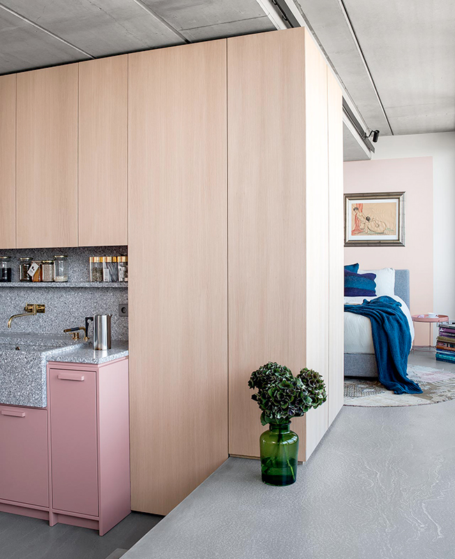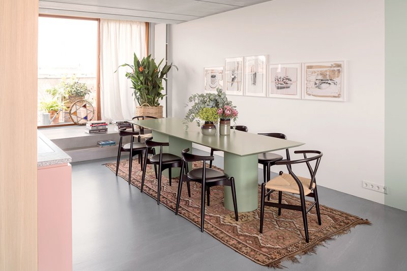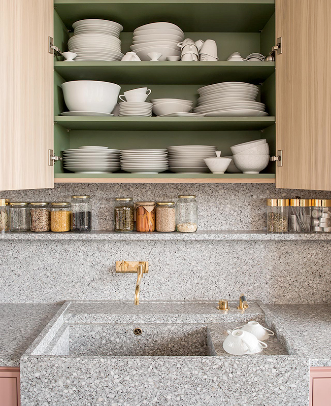 С внешней стороны в эту структуру встроен кухонный гарнитур с рабочими поверхностями и фартуком из терраццо и нижними шкафами нежно-розового цвета. Палитру разбавляет светло-зеленый обеденный стол, изготовленный на заказ. Его оттенок перекликается с внутренней отделкой верхних кухонных шкафов.
