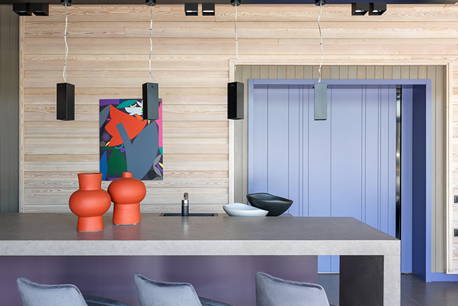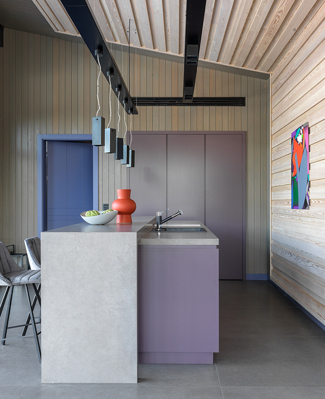 Принято считать, что лучший партнер для светлого дерева — белый цвет. Архитекторы BIGO не стали следовать стереотипам. Они добавили сочных красок, среди которых ведущую роль играют оттенки фиолетового. Во-первых хозяйка этот цвет любит, во-вторых, он образовал небанальный и очень красивый дуэт с деревом. Яркий интерьер — полная противоположность сдержанному фасаду.