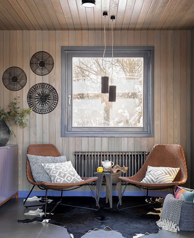 Кресло Ligne Roset подошло в интерьер еще и благодаря своему рельефу: он созвучен ритму обшивки из досок.