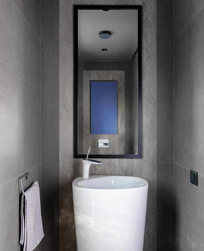 Санузел по контрасту с основным интерьером сделан серым, строгим. Крупноформатный керамогранит Arch-Skin воспроизводит фактуру цемента. Раковина Laufen. Смеситель Axor Hansgrohe. Зеркало выполнено на заказ компанией «Декон+».