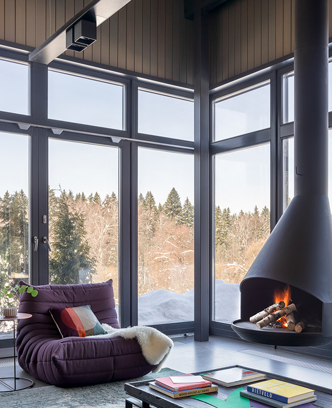 Гостиная. Кресло Ligne Roset, рядом с ним приставной столик Walter Knoll. Плед и подушки Dantone Home. Ковер Kover Buro. Камин Traforart — архитекторы выбрали подвесную модель, потому что она минимально закрывает панораму.