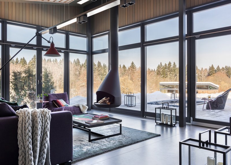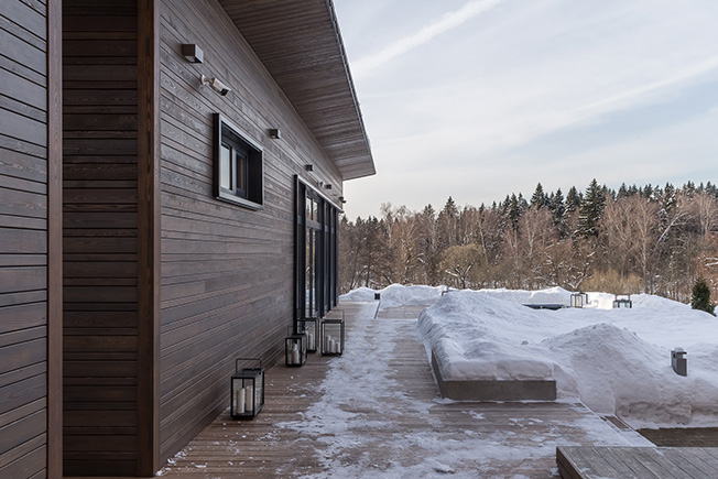 Площадь остекления внушительна. Летом фасад раздвигается и гостиная объединяется с террасой. Такое единение интерьера с природой легко представить себе в модернистских постройках где-нибудь в Бразилии или Калифорнии — при должных технологических предпосылках оно достижимо и в российской средней полосе.