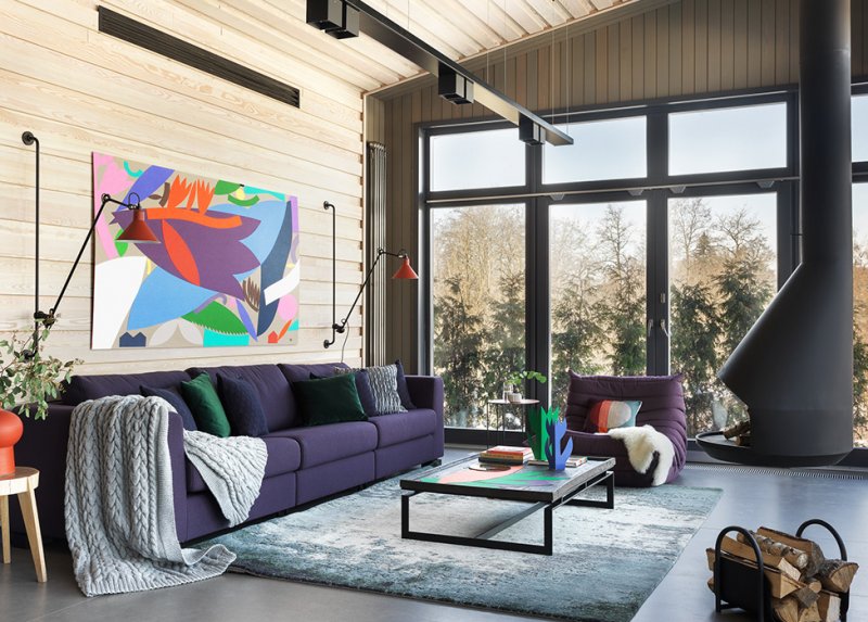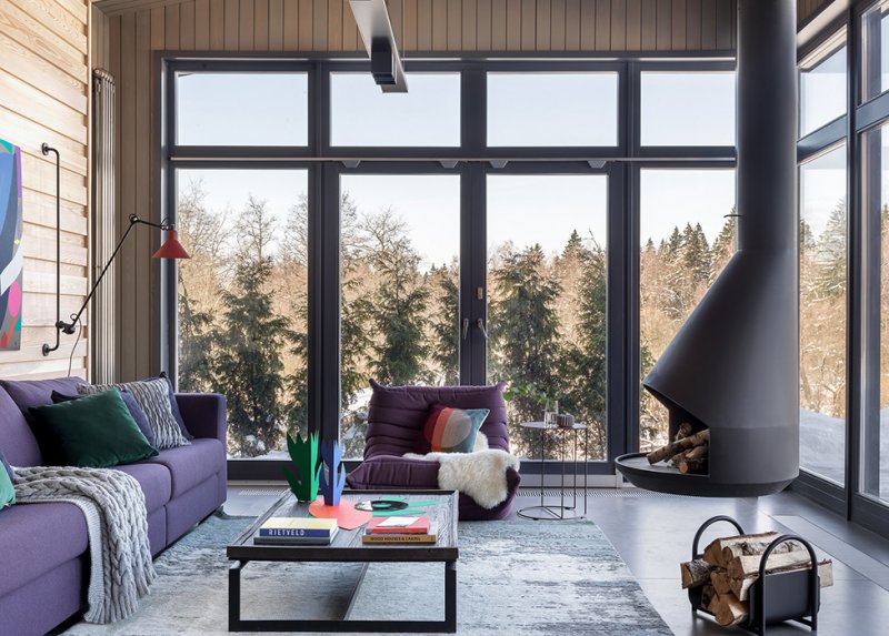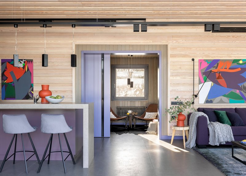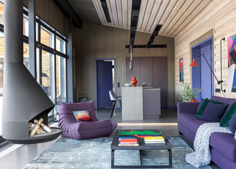 Марина Бирюкова и Елизавета Голубцова (Архитектурная группа BIGO) построили для своих давних заказчиков домик для отдыха. В интерьере сочетали настроение альпийского шале и сочные краски, среди которых преобладает фиолетовая.