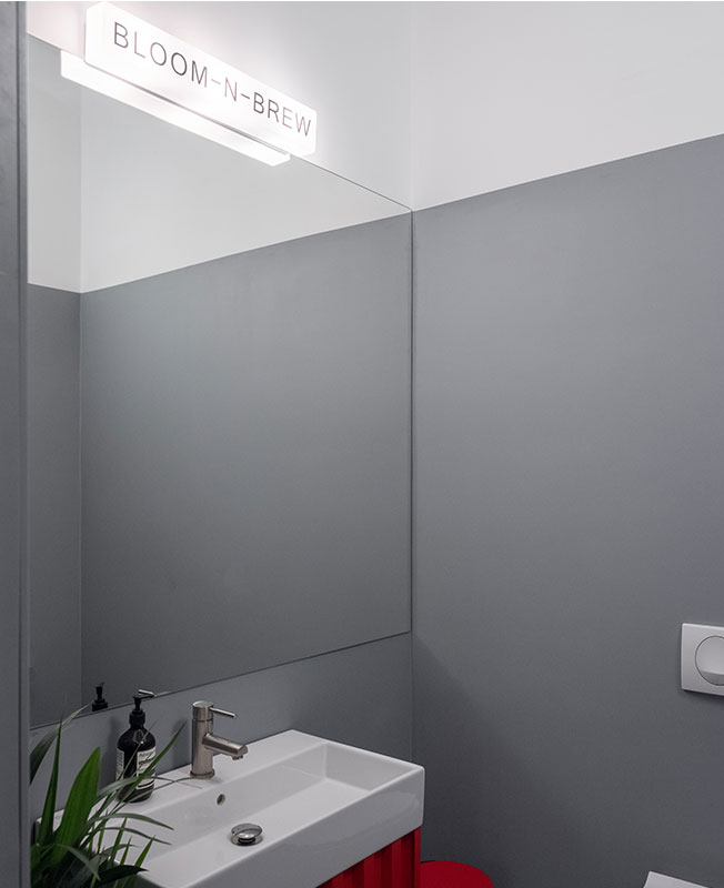 Основатель студии Asketik, дизайнер Максима Максимов, известен лаконичными объектами из алюминия — вешалками для одежды, полками и светильниками. Крючки для сумок на барной стойке Bloom-n-Brew Factoria как раз авторства Максима.