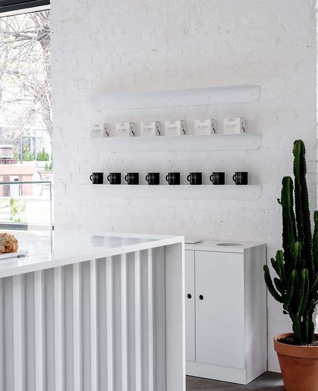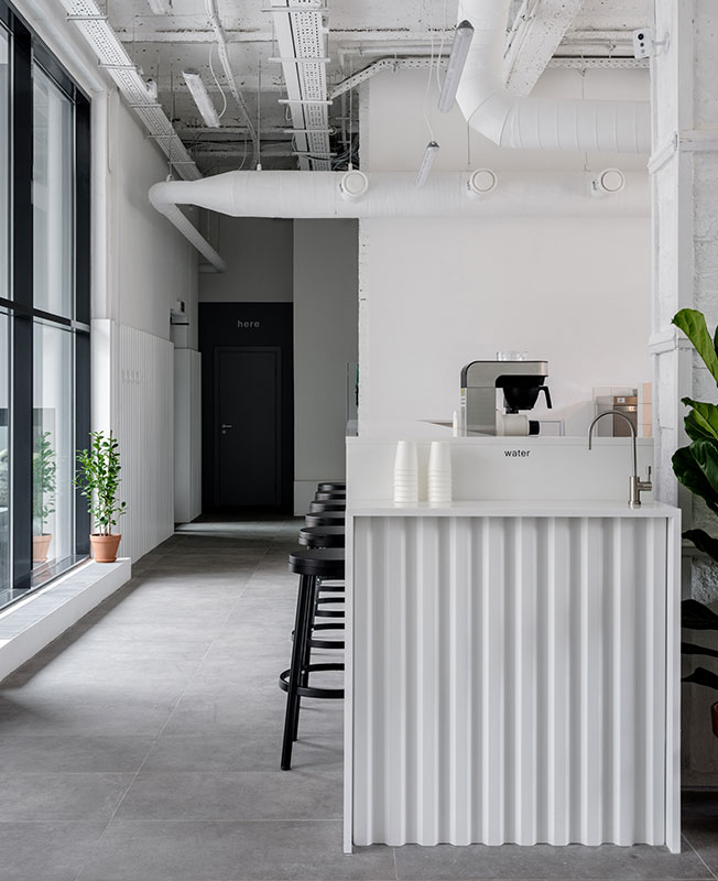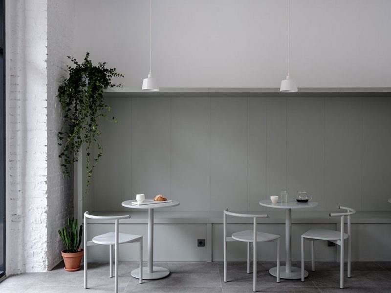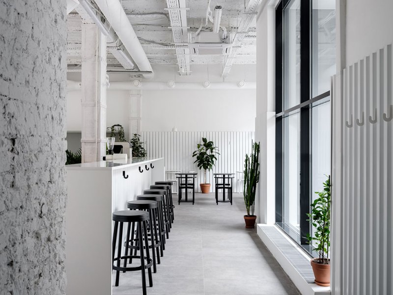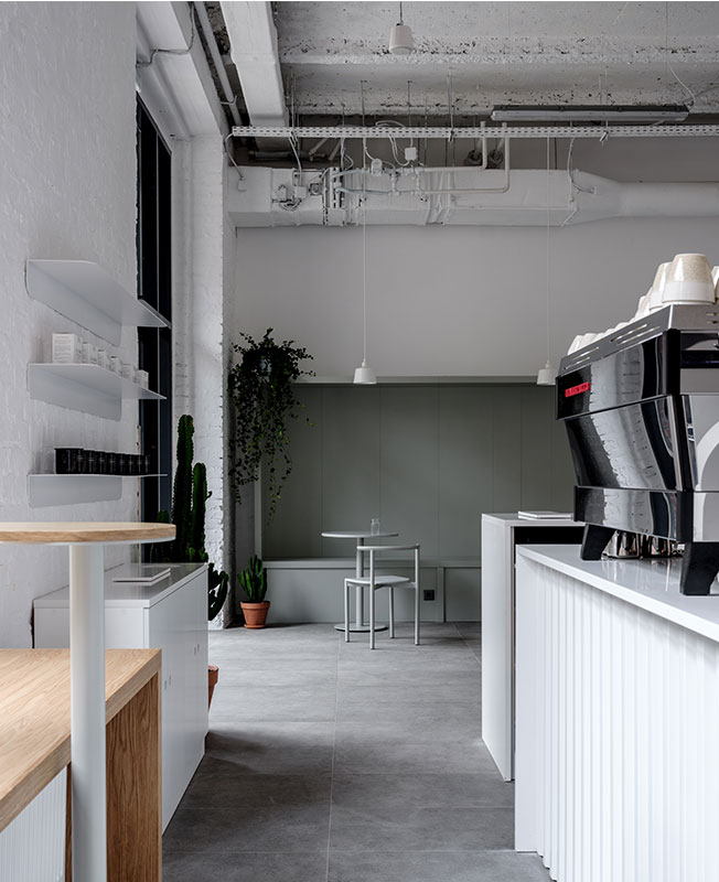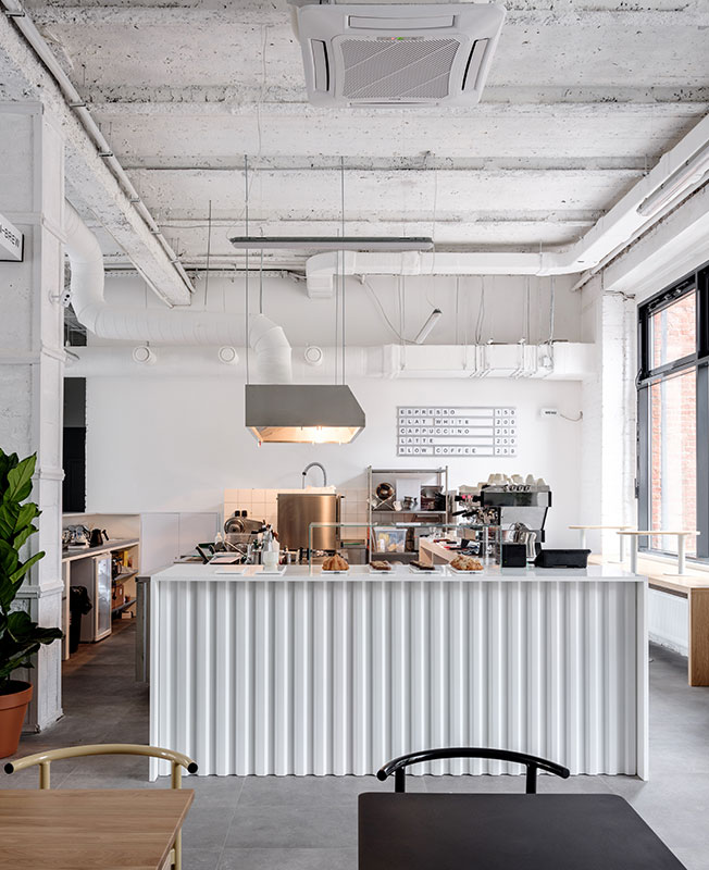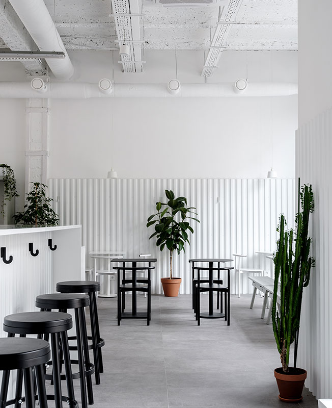 Студия Asketik оформила пространство кофейни Bloom-n-Brew Factoria в Москве. Заведение площадью 115 кв. метров расположено в здании бывшей шелкопрядильной фабрики, поэтому авторы проекта использовали в интерьере материалы, предметы освещения и мебель в духе советских заводов. Белый профнастил, промышленные светильники, кирпичная кладка, потолок с открытыми коммуникациями и растения в кадках ссылаются на первоначальное предназначение помещения. nonehttps://www.instagram.com/asketik/https://www.facebook.com/profile.php?id=100009306852182http://asketik.com/ Принципа аскетичности придерживаются не только в интерьере, но и в меню. Здесь делают ставку на простые и понятные ингредиенты. Гостям предлагают кофе, сезонные авторские напитки, выпечку, сэндивичи и салаты. Основатель студии Asketik, дизайнер Максима Максимов, известен лаконичными объектами из алюминия — вешалками для одежды, полками и светильниками. Крючки для сумок на барной стойке Bloom-n-Brew Factoria как раз авторства Максима. • Москва, ул. Вятская, 27, стр. 2.