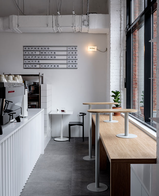 Принципа аскетичности придерживаются не только в интерьере, но и в меню. Здесь делают ставку на простые и понятные ингредиенты. Гостям предлагают кофе, сезонные авторские напитки, выпечку, сэндивичи и салаты.