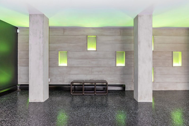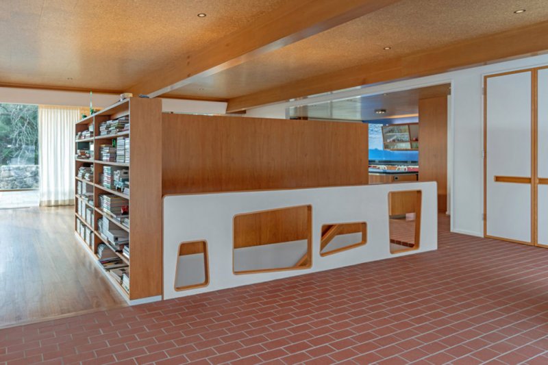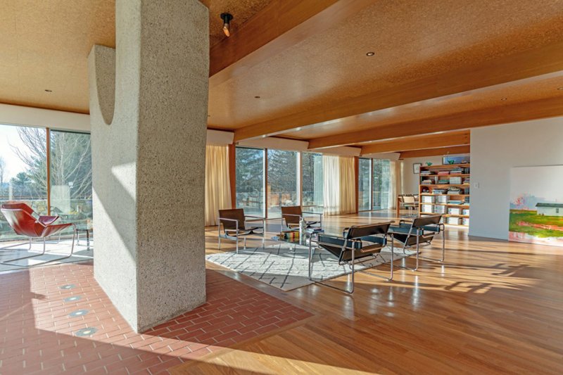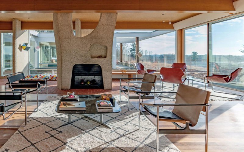Один из самых прекрасных примеров, характеризующий руку Бройера— бетонный камин в центре гостиной открытой планировки. Древовидная скульптурная форма окружена стенами из стекла, натуральных материалов и непрерывным буколическим пейзажем.