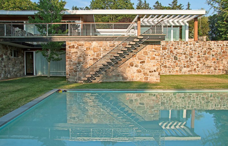 На верхнем этаже находятся остальные спальни, в том числе мастер-спальня. Гостиная и столовая выходят на длинную мощеную террасу с площадками для приема гостей, куда также можно попасть из зоны бассейна по наружной лестнице с характерными для Бройера металлическими перилами.