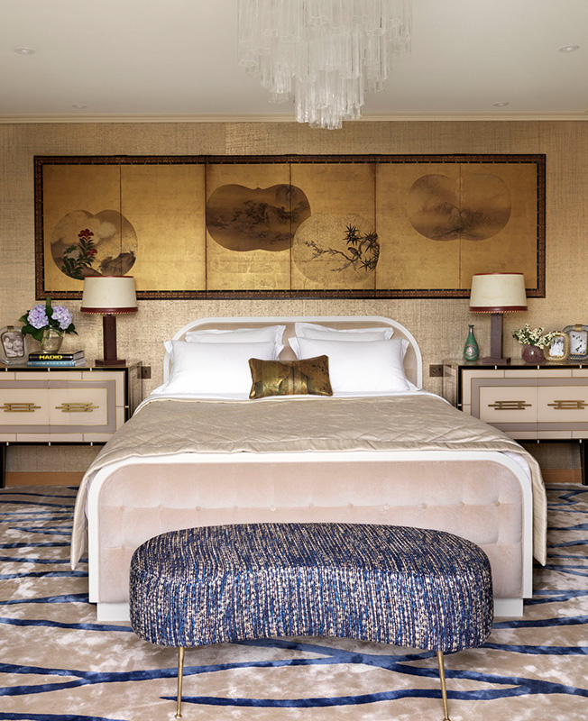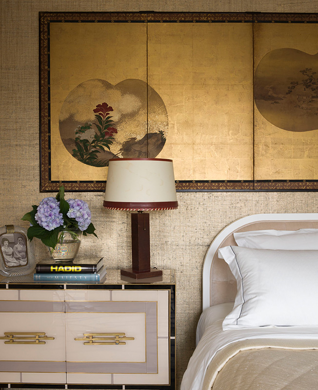 Хозяйская спальня. Кровать изготовлена на заказ в бархате Holland & Sherry. Над ним редкая японская ширма XVII века. На прикроватных тумбах 1970-х лампы в отделке из кожи, автор — Поль Дюпре-Лафон. Стены отделаны обоями Phillip Jeffries из рафии с металлизированным покрытием.