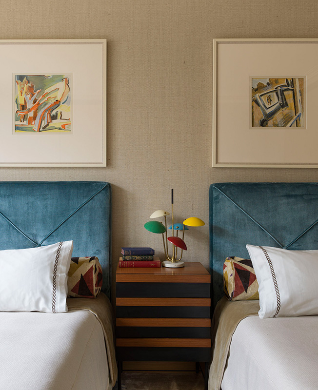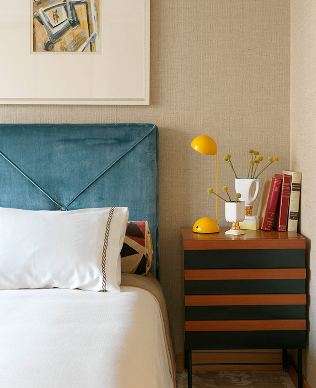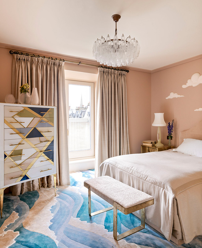 Комната дочери. Кровать в шелке Pierre Frey и ковер изготовлены на заказ. Скамья Мило Бомана. Шкаф из латуни и стекла, настольная лампа — всё Италия, 1970. Люстра Карло Скарпы, 1950.