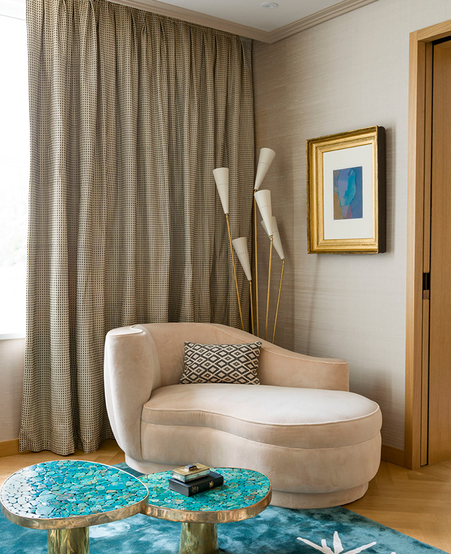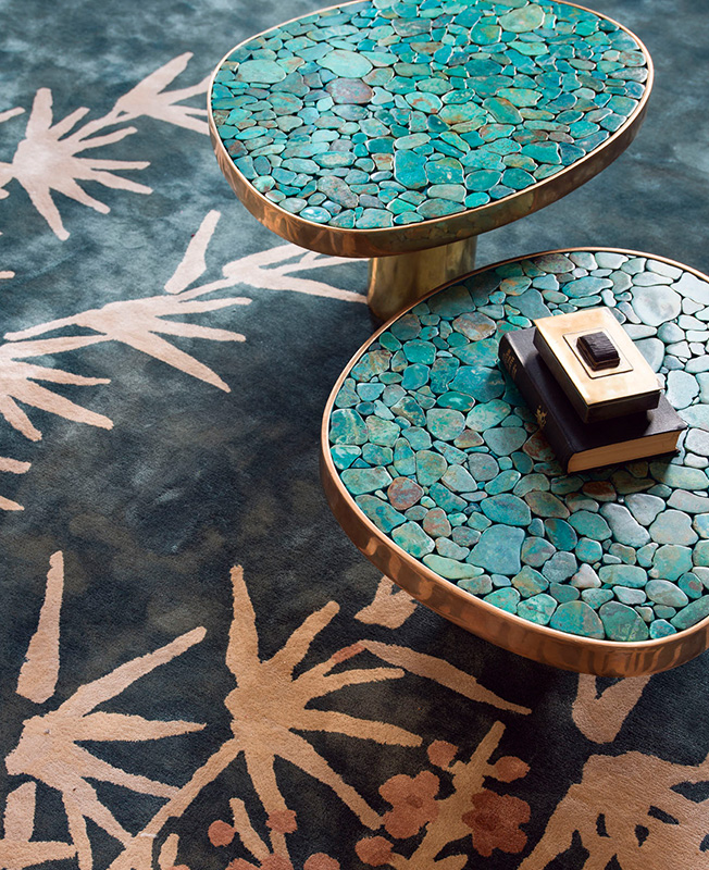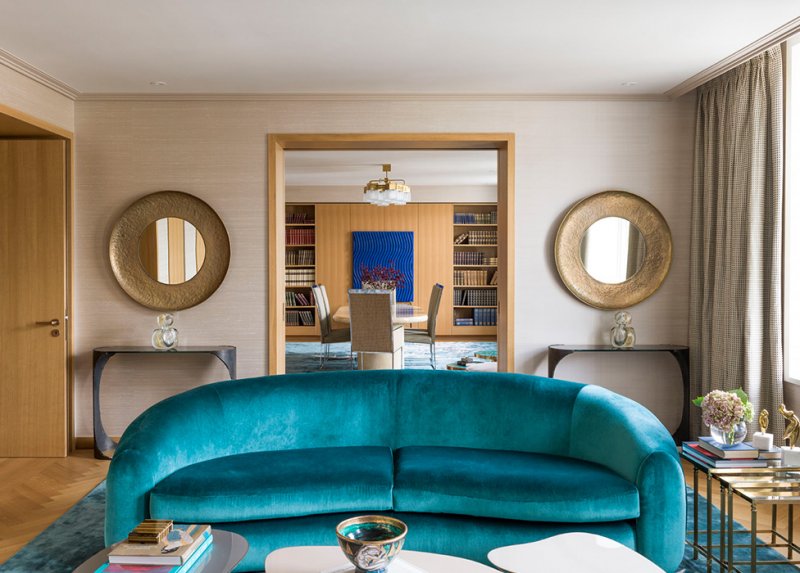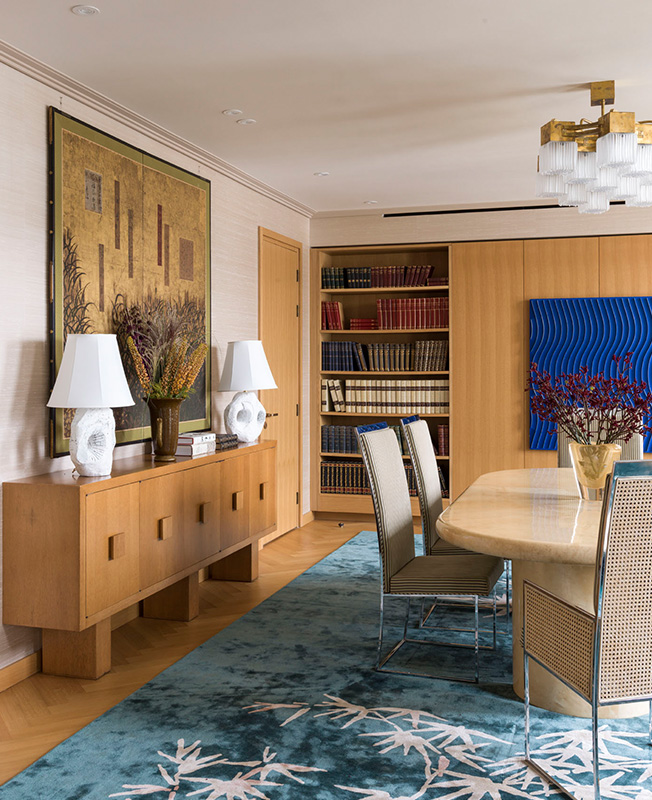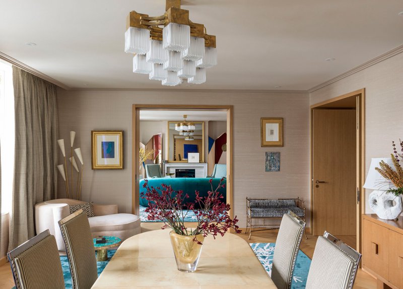 Ираклий Зария начал интерьер с ковров, считая их самыми большими картинами в комнатах, и создал два «полотна» — для гостиной и столовой — по мотивам японского ар-деко. Ковры определили сочную палитру, в которой много бирюзы. Один из самых ярких предметов — винтажный диван в бархате Domenique Kieffer, оммаж творчеству Жана Руайера, которого Ираклий называет в числе своих любимых авторов.