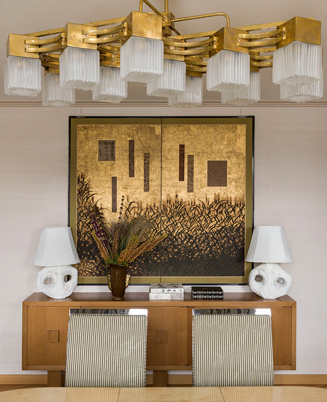 Украшение столовой — японская ширма XVI века со вставками из любовных писем на китайском языке. На серванте 1940-х французские керамические лампы 1960-х. Итальянская люстра из латуни и стекла, 1980.