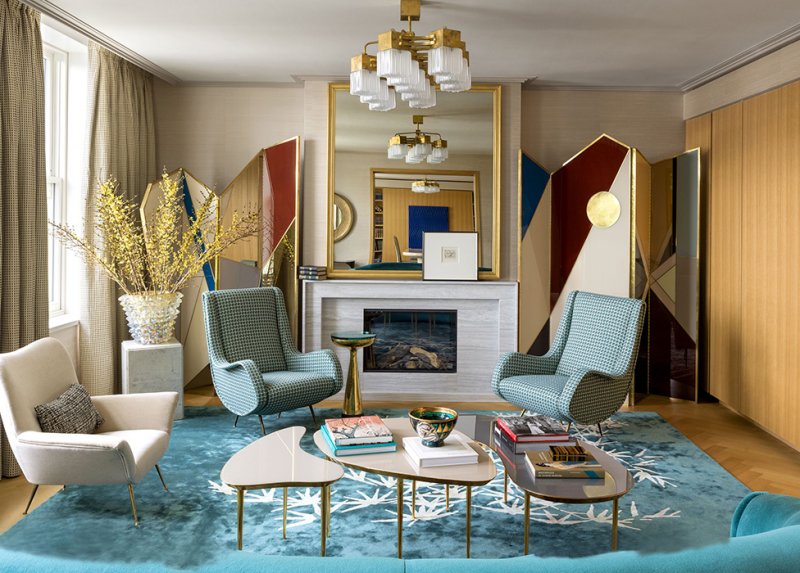 Гостиная. У камина три кресла 1960-х. Столики и изготовленные на заказ ширмы: Galerie Glustin. На постаменти ваза венецианского стеклодува Пино Синьоретто, 1970. Шелковый ковер и зеркало в позолоченной рама выполнены по дизайну автора проекта. На камине принт Олега Кудряшова.