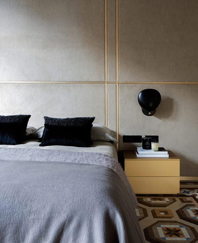 Изобилие естественного света подчеркивает выверенную с элеменатми латуни: от латунного изголовья кровати до позолоченных прикроватных тумбочек Praddy.