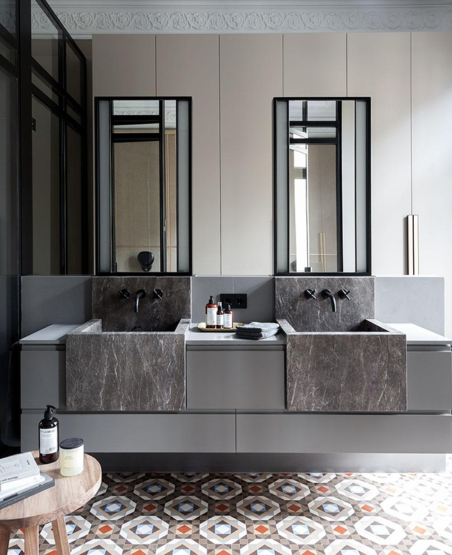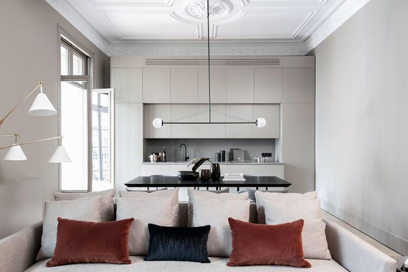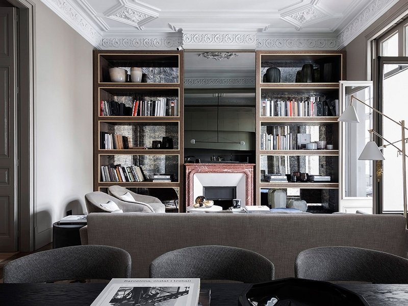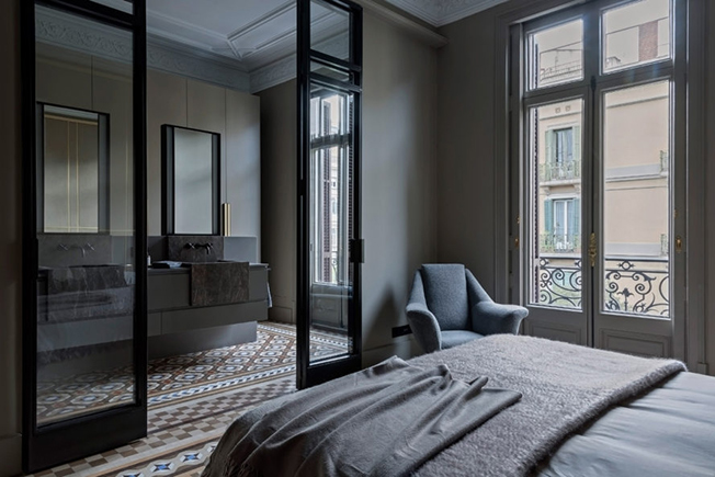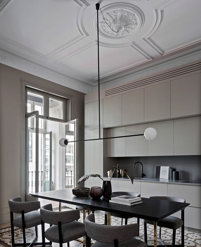 Район Эшампле в Барселоне — заветный адрес для любителей испанского ар нуво. Антонио Гауди был в числе архитекторов, которые строили этот район, а одна из квартир в его доме была недавно отремонтирована местной дизайнерской фирмой Mimouca Barcelona во главе с Мартой Касас. Сводчатые потолки, оригинальные витражи и мозаичный пол стали отправной точкой для Mimouca Barcelona. Нежный оттенок норки был нанесен на стены, чтобы подчеркнуть декоративный потенциал орнаментального покрытия. Фризы и молдинги были тщательно отреставрированы. Квартира площадью 180 кв. метров принадлежит одному из крупнейших коллекционеров искусства из Стамбула, который поселился здесь вместе со своей женой и детьми влюбились в архитектуру, оценив культурное обаяние Эшампле. Окна выходят как на две стороны — на улицу и во внутренний двор. В квартире кухня, столовая и гостиная объединены в общее пространство. Характер всему интерьеру задает отреставрированная мозаика от легендарного производителя Nolla. Лишь в коридоре, где восстановить ее не удалось, положен паркет. В гостиной к оригинальному валенсийскому розовому мрамору были подобраны сделанные на заказ книжные полки из дуба, диван Casadesus и винтажные кресла 1950-х годов Джиджи Радиче, переобитые бархатом Rubelli. В кухне-столовой черные смесители от Dornbracht контрастируют с обеденным столом из матового дуба от Mimouca Barcelona и стульями Tauro от Andreu World. А в ванной они хорошо смотрятся с зеркалами и парой итальянских каменных раковин. Изобилие естественного света подчеркивает выверенную с элеменатми латуни: от латунного изголовья кровати до позолоченных прикроватных тумбочек Praddy.