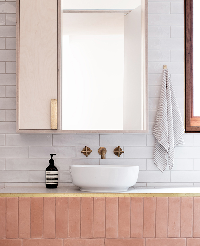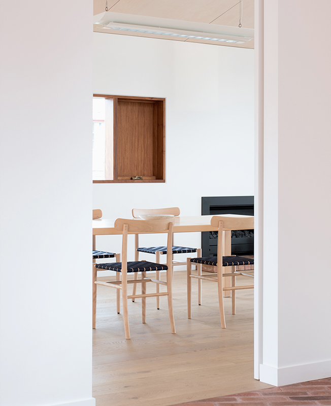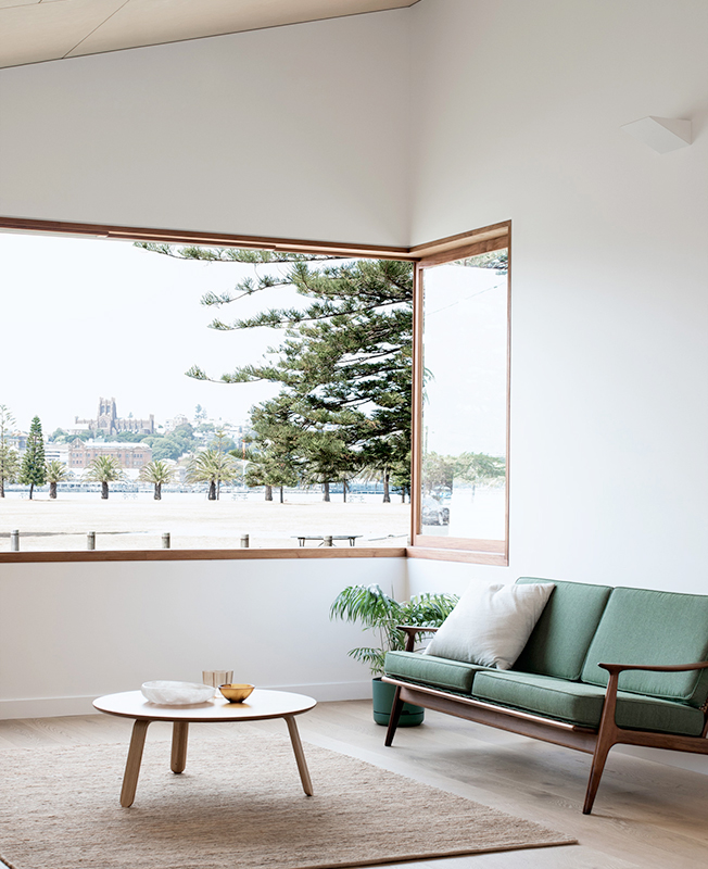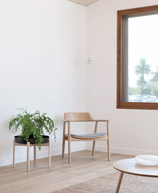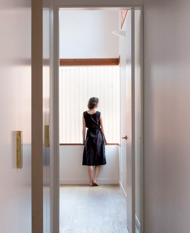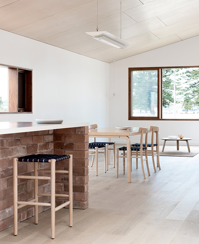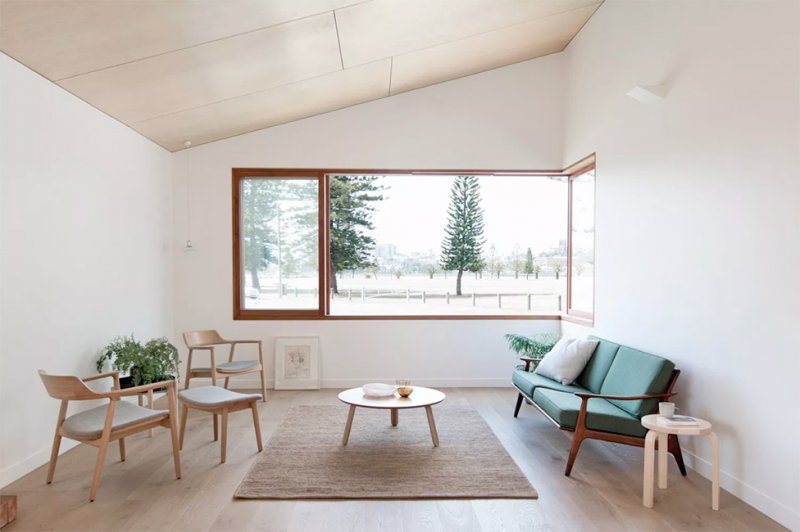 Внутри — лаконичные и светлые пространства с высокими потолками и большими окнами, которые обеспечивают обилие дневного света. Белые стены и светлое дерево служат нейтральным фоном для деталей более сложных природных оттенков. Несмотря на все усилия по созданию неприхотливого интерьера, Three Piece House имеет эффектную ванную комнату с широкой душевой зоной с выложенным плиткой сиденьем и акцентами из латуни.