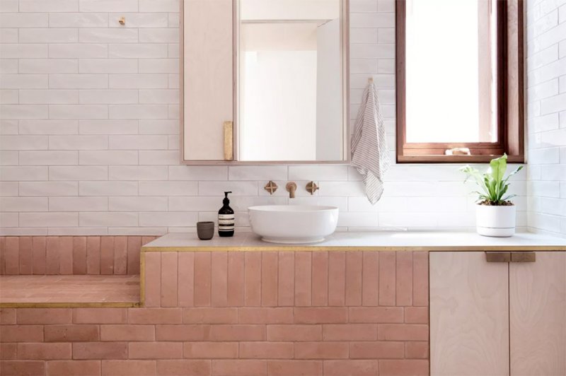 Кирпичом выложили и дорожки, которые ведут в дом, чуть «заходя» внутрь в зоне холла, связывая внутреннее и наружное пространства. Его же использовали для оформления кухонного острова, а похожего оттенка плитку — для облицовки тумбы под раковину в ванной комнате.