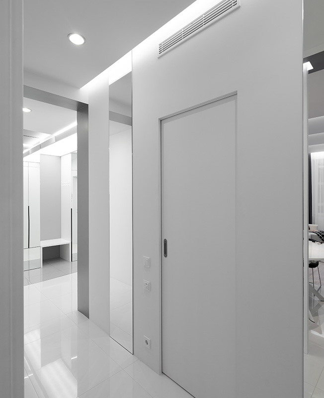 Архитекторам был необходим чистый белый цвет, который бы не желтил и не уходил в серый оттенок — его оказалось не так просто найти у производителей плитки. Поскольку основной акцент сделан на контрастной отделке и геометрии пространства, мебель использована максимально простая, функциональная: обеденный стол Pranzo, стулья Calligaris, кровать Sleepeesleep, кухня «Мария». В проекте применена сантехника Florim Сeramiche и Duravit, двери Union, светильники Centrsvet. В зоне кухни смеситель японского бренда Omoikiri гармонирует с красной буквой М.