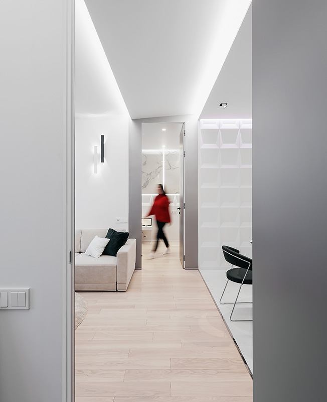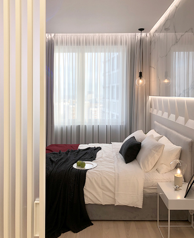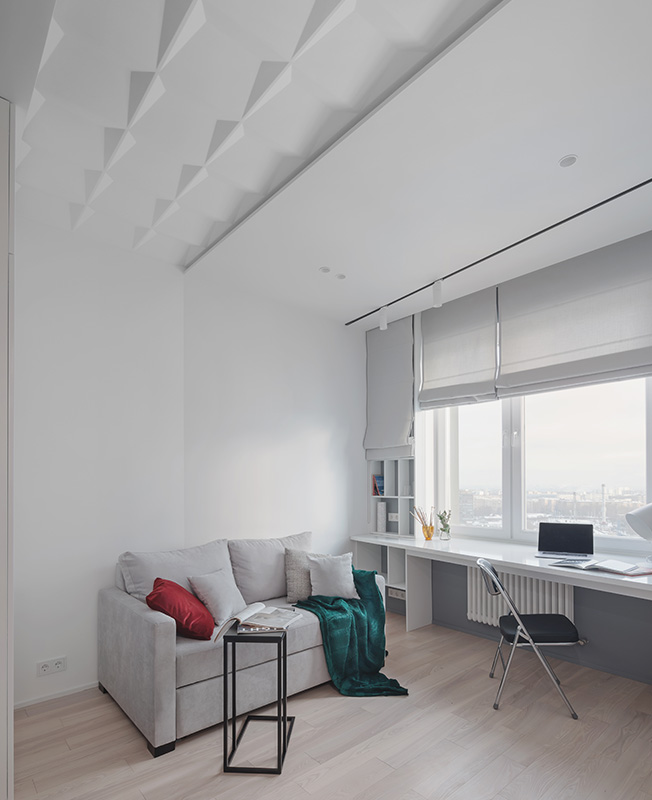 Дарья и Леонид Соловьевы (архитектурная группа ID Studio) спроектировали квартиру для молодой девушки. Главной задачей авторов было создать нестандартный интерьер, при этом вписаться в запланированный бюджет. nonehttps://www.instagram.com/idstudio.ag/nonehttps://id-ag.ru/ Двухкомнатная квартира расположена в жилом комплексе V-House в районе Нагорной, в монолитно-кирпичном доме. Ее можно было бы назвать вполне обычной, если бы не длинный темный коридор: он занимал 16 кв. метров, при том что вся площадь квартиры составляла 82 кв. метра. Архитекторы избавились от коридора и узких проходов, создав единое студийное пространство: гостиную объединили с кухней, которую разместили в нише. Одновременно оборудовали отдельный кабинет для работы и творчества — то есть сохранили две изолированные комнаты. Вместо небольшого туалета и ванной комнаты сделали два полноценных санузла: один — гостевой с душевой кабиной, другой — хозяйский с приватной зоной спа. Добавили обязательную для комфортной жизни гардеробную. Вход в нее возможен как из холла, так и из спальни — это оказалось очень удобным, открыв свободу в перемещении. Заказчица — молодая креативная девушка — хотела интерьер нестандартный, но в реализации не сложный. Одной из идей стало вписать в квартиру знак московского метрополитена — букву «М». Она дала развитие проекту: подтолкнула к выбору индустриальной концепции и вдохновило авторов на многие находки. Чтобы продолжить необычную тему, архитекторы использовали гипсовые рельефные панели в стилистике промышленного забора ПО-2: созданный архитектором Борисом Лахманом в 1970-х, он имеет славу самого растиражированного архитектурного объекта в России. Классическую плиту ПО-2 авторы переработали, сделали рельеф более заглубленным и выразительным. Панели использовали на стенах и потолке. Форма изготовлена индивидуально на производстве. Один из основных материалов проекта — керамогранит. Он применен не только на полу, но и на стенах, в том числе в спальне. Керамогранитом под черный мрамор отделана и барная стойка на кухне, в этой части помещения он заходит на потолок. Стены покрашены, а во влажных зонах покрыты микроцементом. Также в гостиной для обрамления проемов использована краска с эффектом металлической поверхности. На полу в жилых комнатах уложена инженерная доска. Работая над 3D-визуализацией, авторы обсуждали несколько видов натурального камня для разных помещений, в гостевом санузле остановились на ярко-красном мраморе. Впоследствии оказалось, что его невозможно привезти в Россию. В итоге нашли выход: с помощью графического дизайнера воспроизвели рисунок этого мрамора в большом формате и распечатали на стекле. Получилось глубокое изображение, которое стало альтернативой натуральному камню. Архитекторам был необходим чистый белый цвет, который бы не желтил и не уходил в серый оттенок — его оказалось не так просто найти у производителей плитки. Поскольку основной акцент сделан на контрастной отделке и геометрии пространства, мебель использована максимально простая, функциональная: обеденный стол Pranzo, стулья Calligaris, кровать Sleepeesleep, кухня «Мария». В проекте применена сантехника Florim Сeramiche и Duravit, двери Union, светильники Centrsvet. В зоне кухни смеситель японского бренда Omoikiri гармонирует с красной буквой М. «В первую очередь мы очень рады, что удалось реализова