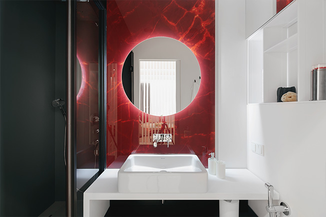 Работая над 3D-визуализацией, авторы обсуждали несколько видов натурального камня для разных помещений, в гостевом санузле остановились на ярко-красном мраморе. Впоследствии оказалось, что его невозможно привезти в Россию. В итоге нашли выход: с помощью графического дизайнера воспроизвели рисунок этого мрамора в большом формате и распечатали на стекле. Получилось глубокое изображение, которое стало альтернативой натуральному камню.