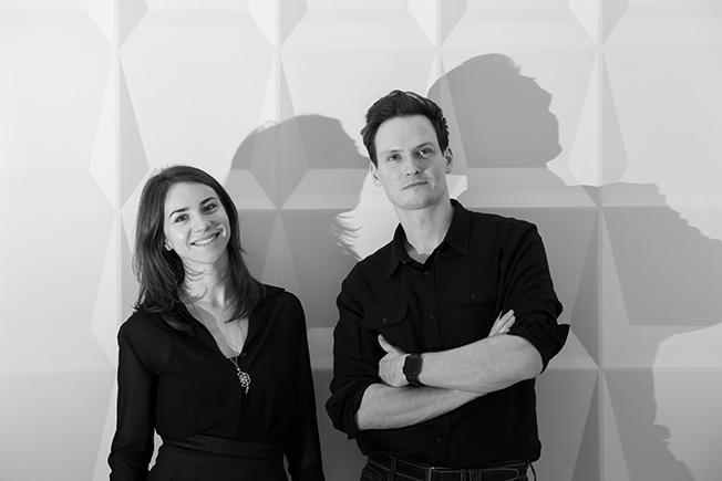 Авторы проекта Дарья и Леонид Соловьевы на фоне гипсовых рельефных панелей собственного дизайна — они разработаны на основе знаменитого промышленного забора ПО-2 архитектора Бориса Лахмана.