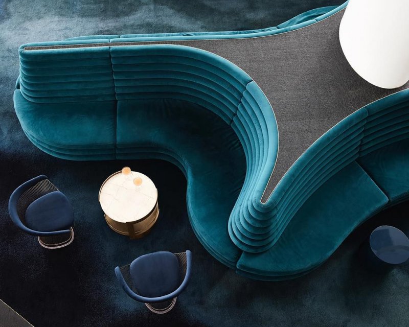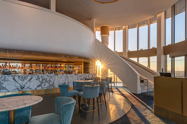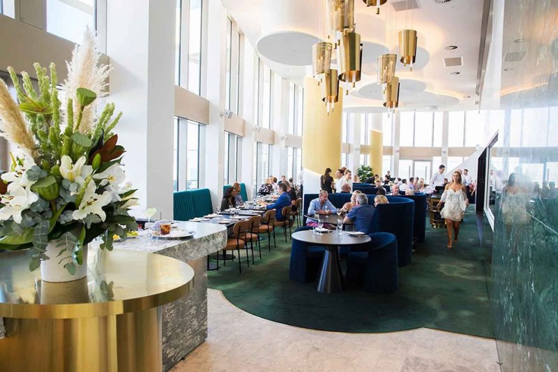 Барная зона рассчитана на 500 гостей. Цветовые палитры в ресторане отражают окружающий пейзаж. Мягко позолоченная латунь покрывает лифты и бары, отражая ночные огни на горизонте. Изогнутые нестандартной формы диваны и стулья обиты бархатом оттенков бирюзы и темной морской синевы. Насыщенная зелень мрамора напоминает о местных залесенных горах Тамборин и Спрингбрук.