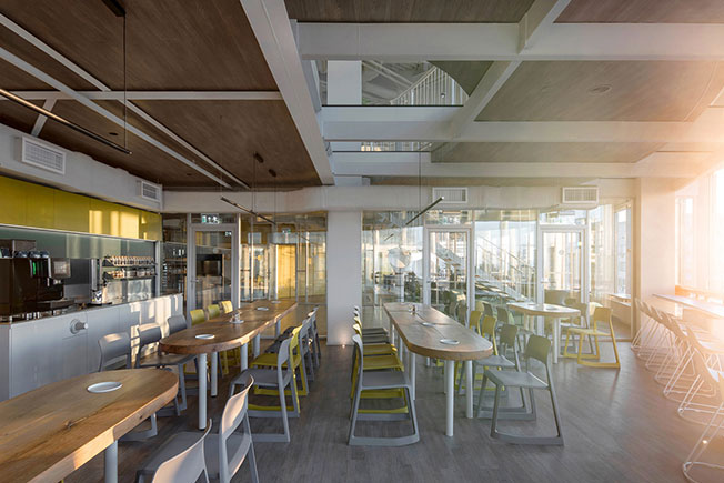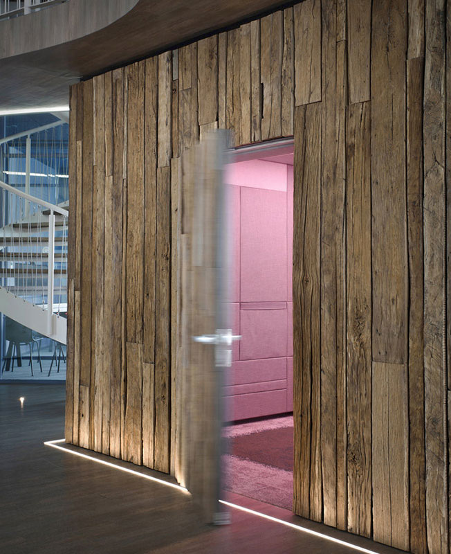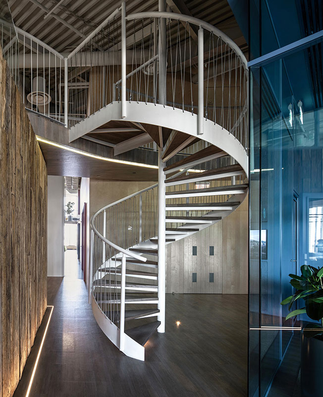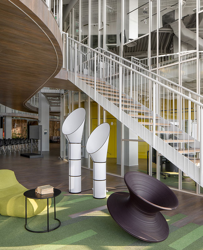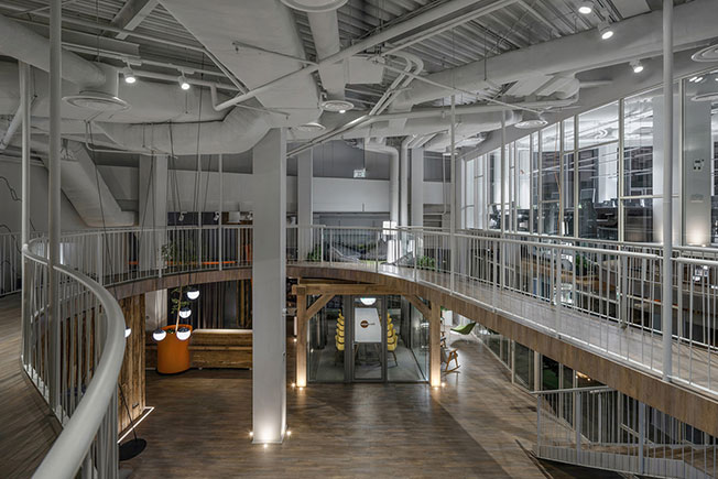 На второй этаж ведут белые лестницы. Здесь расположены более спокойные рабочие зоны, которые соединены между собой извилистыми подвесными «дорожками» длиной 90 метров. Интересно, что реализованная из 25 тонн металла конструкция не имеет опор и подвешена к потолку с помощью тонких столбов. «Дорожки» объединяют различные зоны офиса в цельное пространство со своим ритмом жизни. Также они символизируют неразрывную связь с другими филиалами.