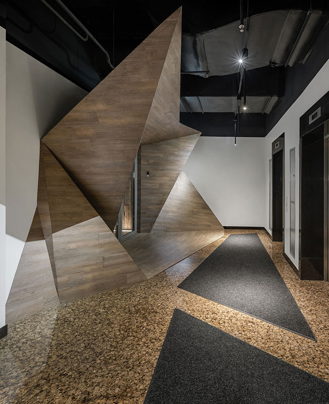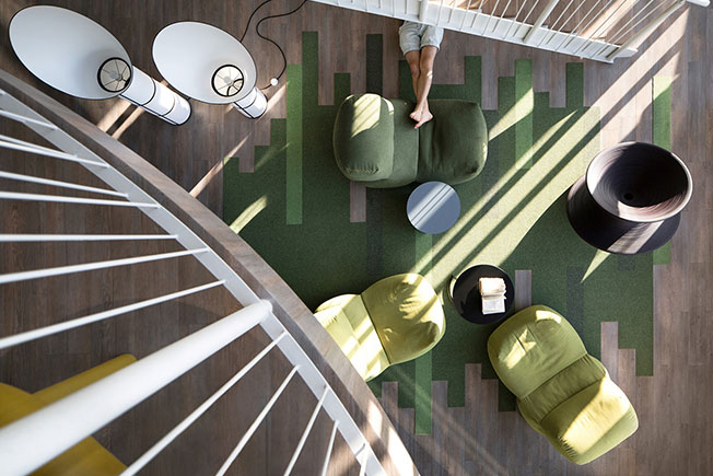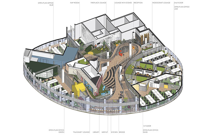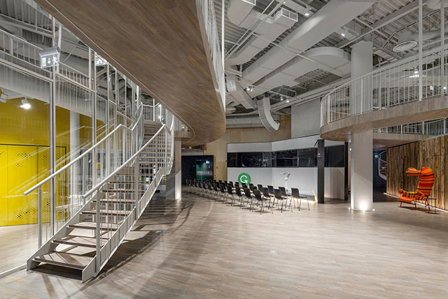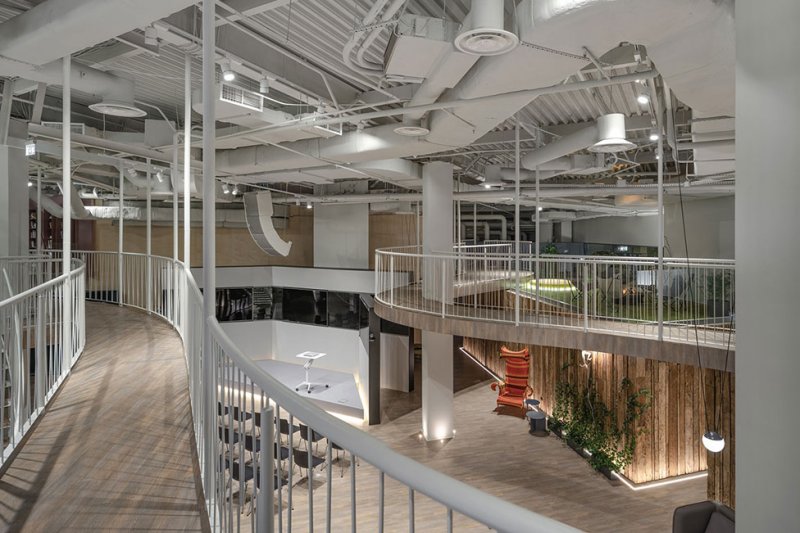 Нижний уровень 1300 кв. метров включает центральный конференц-зал со сценой, рабочие места в опенспейсах, переговорные. В некоторых офисных уголках дизайнеры разместили кресла-мешки для отдыха сотрудников и неформальных встреч. Также для уединенной работы в тишине можно воспользоваться компактными боксами на одного-двух человек.