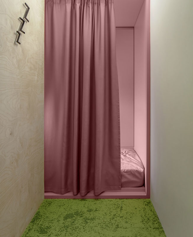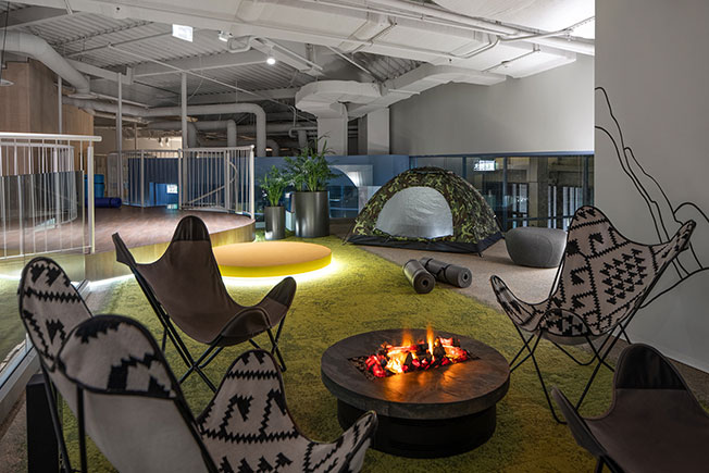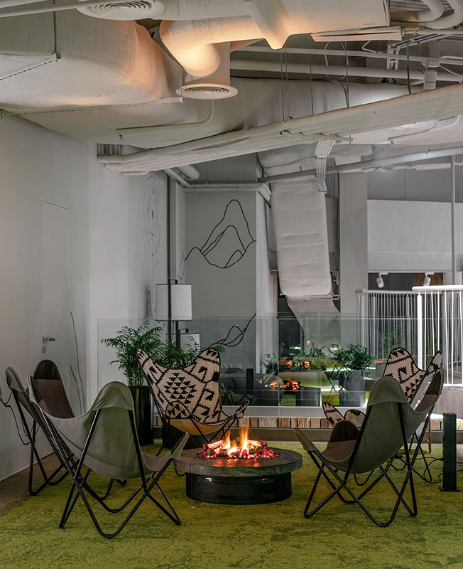Также на втором уровне находится уютная зона отдыха, в центре которой оборудован камин в виде костра, расставлены походные кресла и даже разбиты палатки. Здесь разместилось и несколько объемных боксов, которые предназначены для сна.