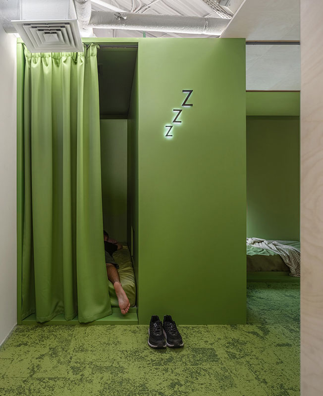 Компания Grammarly работает круглосуточно, оперируя большими объемами данных. Под каждым матрасом установлен датчик веса: как только сотрудник ложится отдыхать, загорается символ сна Zzz на стене у кабины, который указывает на то, что пространство в данный момент занято.