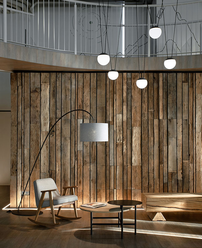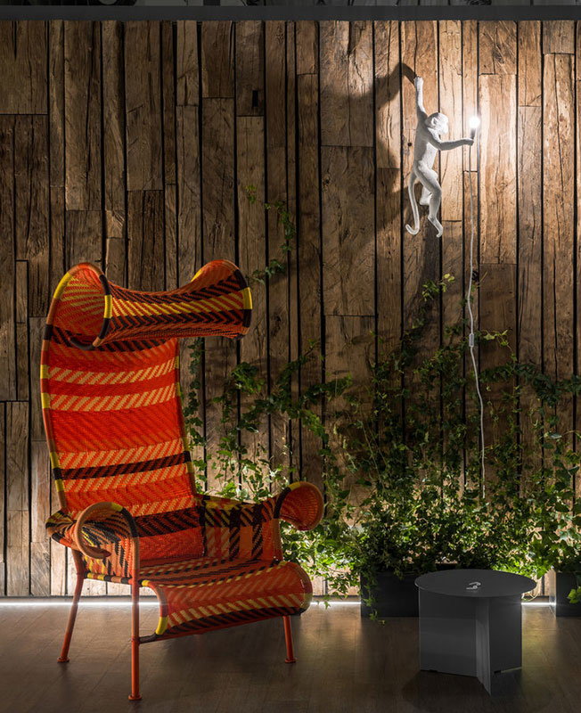 Завершают яркий образ интерьера знаменитые предметы дизайна, среди которых — низкие кресла со спинкой-валиком Sam-Son Константина Грчича, походные складные кресла B.K.F. chair, а также плетеное кресло с высокой спинкой по дизайну Торда Бонтье для Driade.
