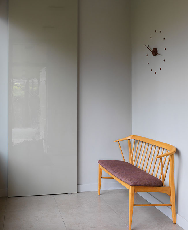 Екатерина Федорова оформила дом в подмосковном поселке для семейной пары с четырехлетним ребенком. В прихожей — винтажная скамья.