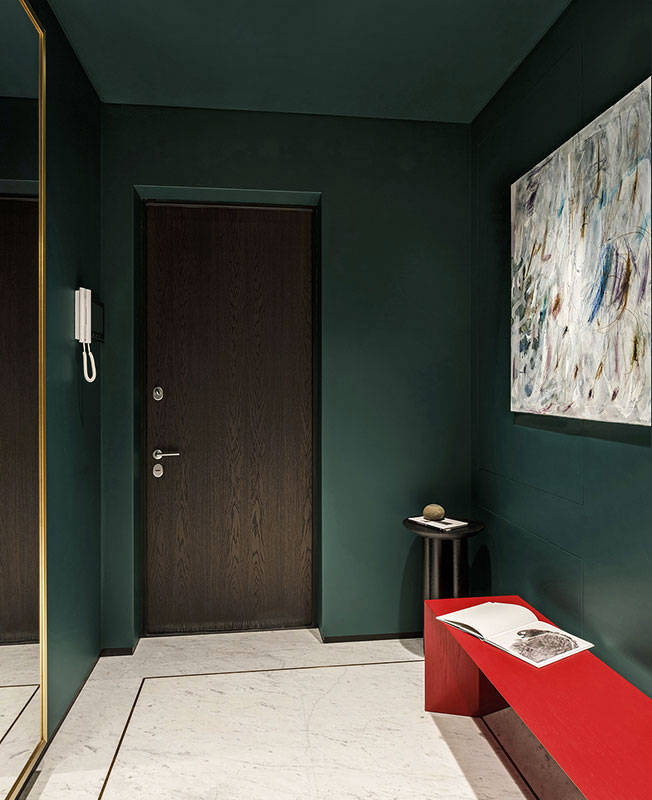 Квартира площадью 160 кв. метров находится в новом доме, в Москве. Дарья Белякова и архитекторы Алексей Борисов и Ксения Караваева, студия ARCH(E)TYPE, назвали этот свой проект «Цвет граната». В прихожей красная скамейка Archipelago.